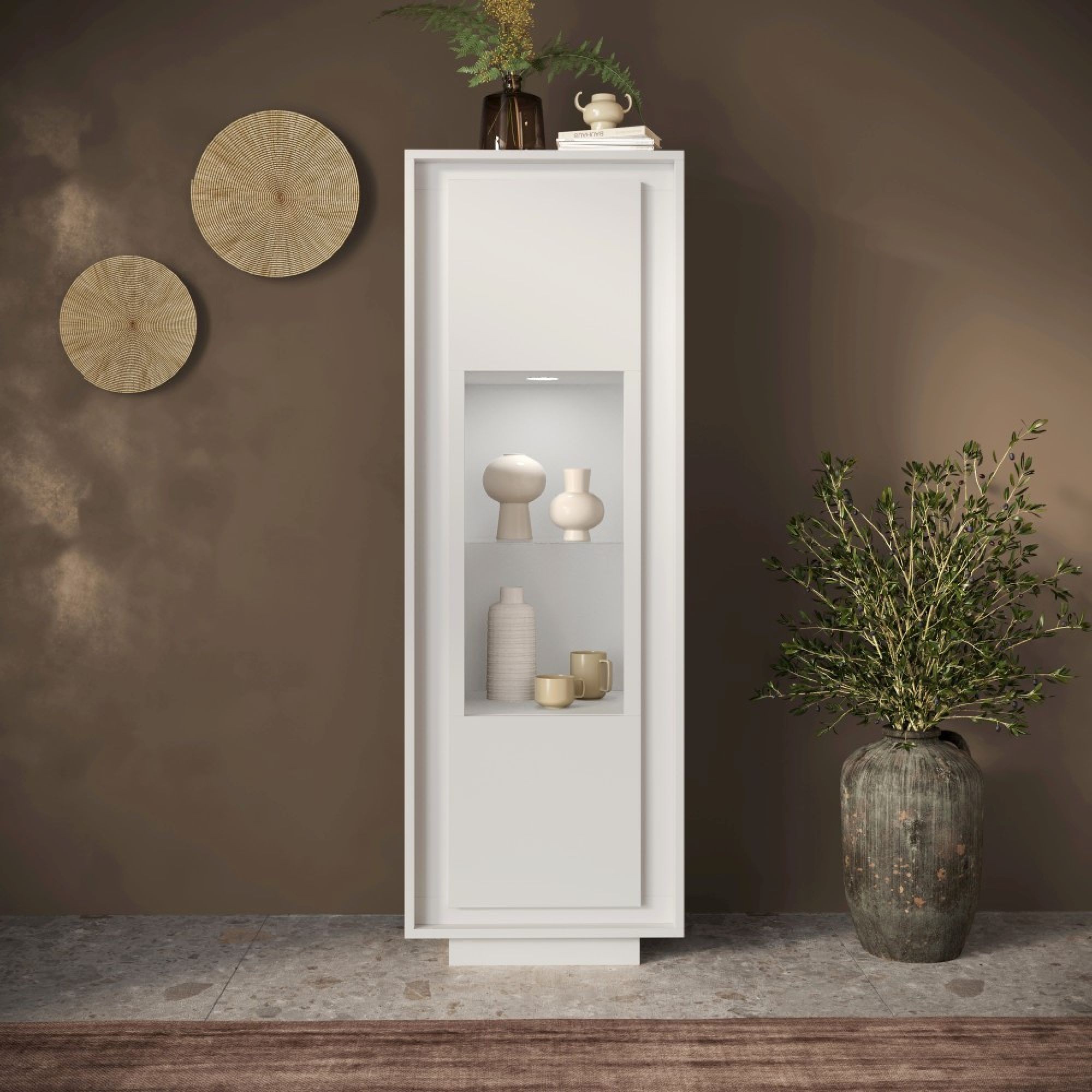 Dotata di un’anta in vetro con ripiani interni, permette di mettere in risalto piatti, bicchieri o oggetti decorativi mantenendoli ordinati e protetti. La finitura bianco opaco dona luminosità all’ambiente e si adatta facilmente a soggiorni dallo stile contemporaneo e minimalista.
