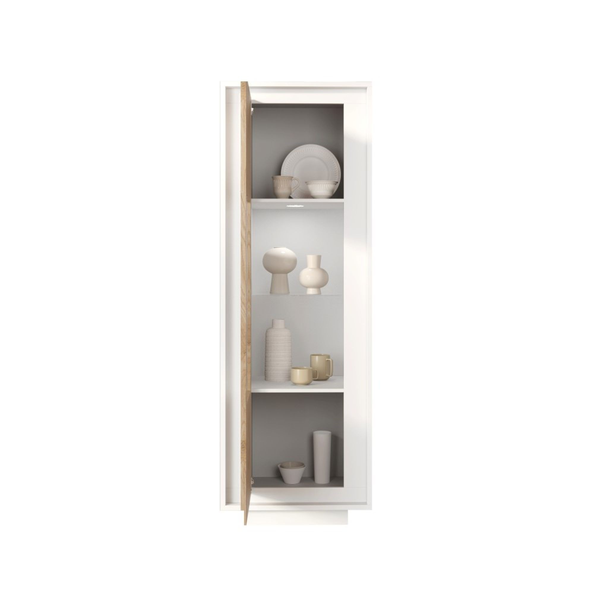 Dotata di un’anta in vetro con ripiani interni, consente di organizzare con stile ogni elemento esposto, valorizzandolo all’interno del living. La finitura bianco opaco abbinata al fondo Cadiz Oak porta luminosità e calore, adattandosi con eleganza agli arredamenti moderni.