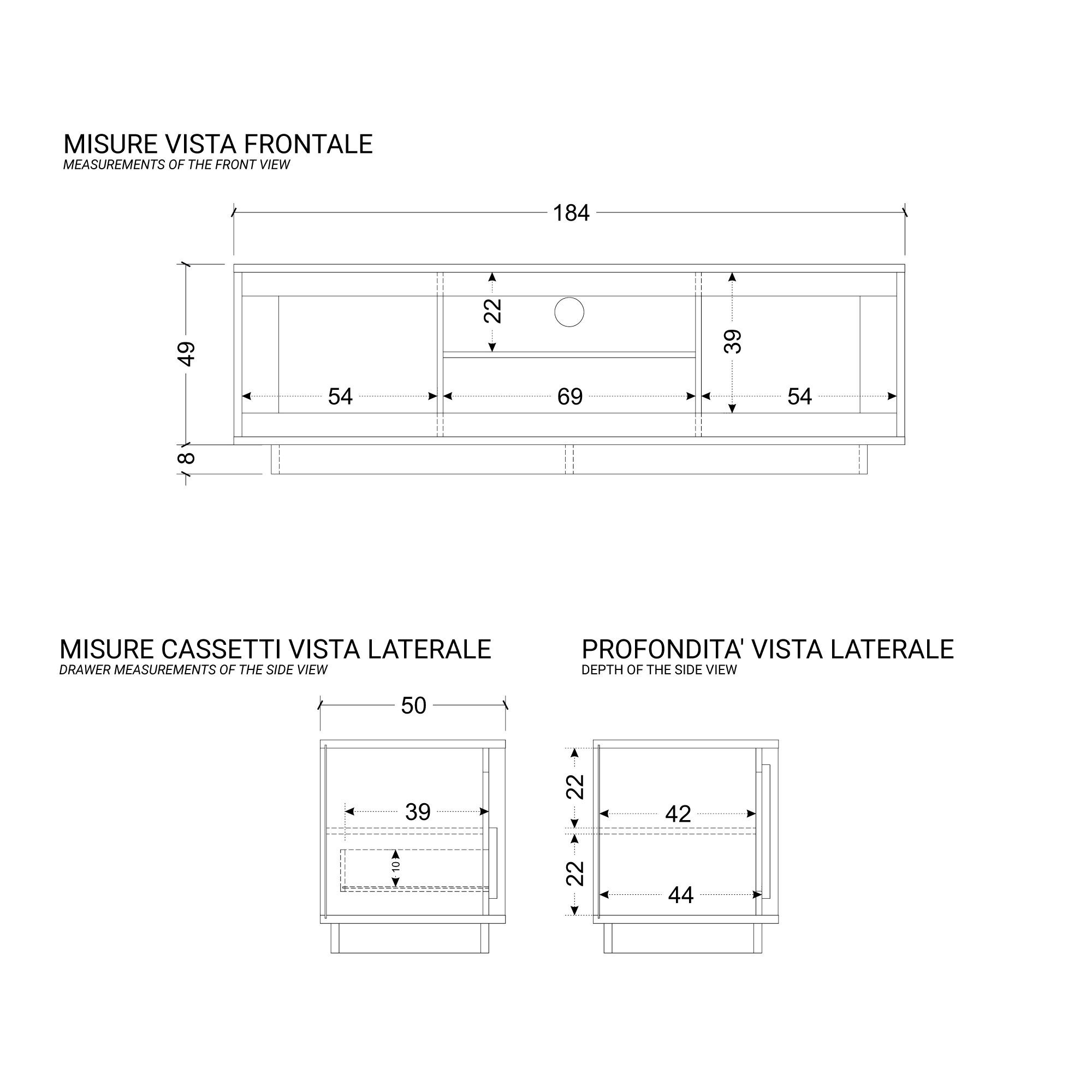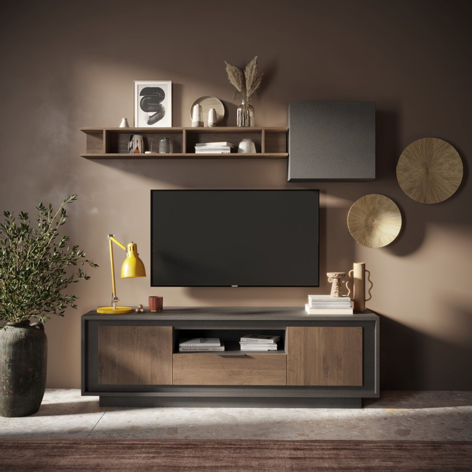 Dotata di 2 ante laterali con ripiani interni e 1 cassetto centrale, consente di organizzare dispositivi, telecomandi e accessori con facilità. La struttura lava abbinata al frontale Mercure Oak crea un contrasto contemporaneo e caldo, perfetto per soggiorni moderni.