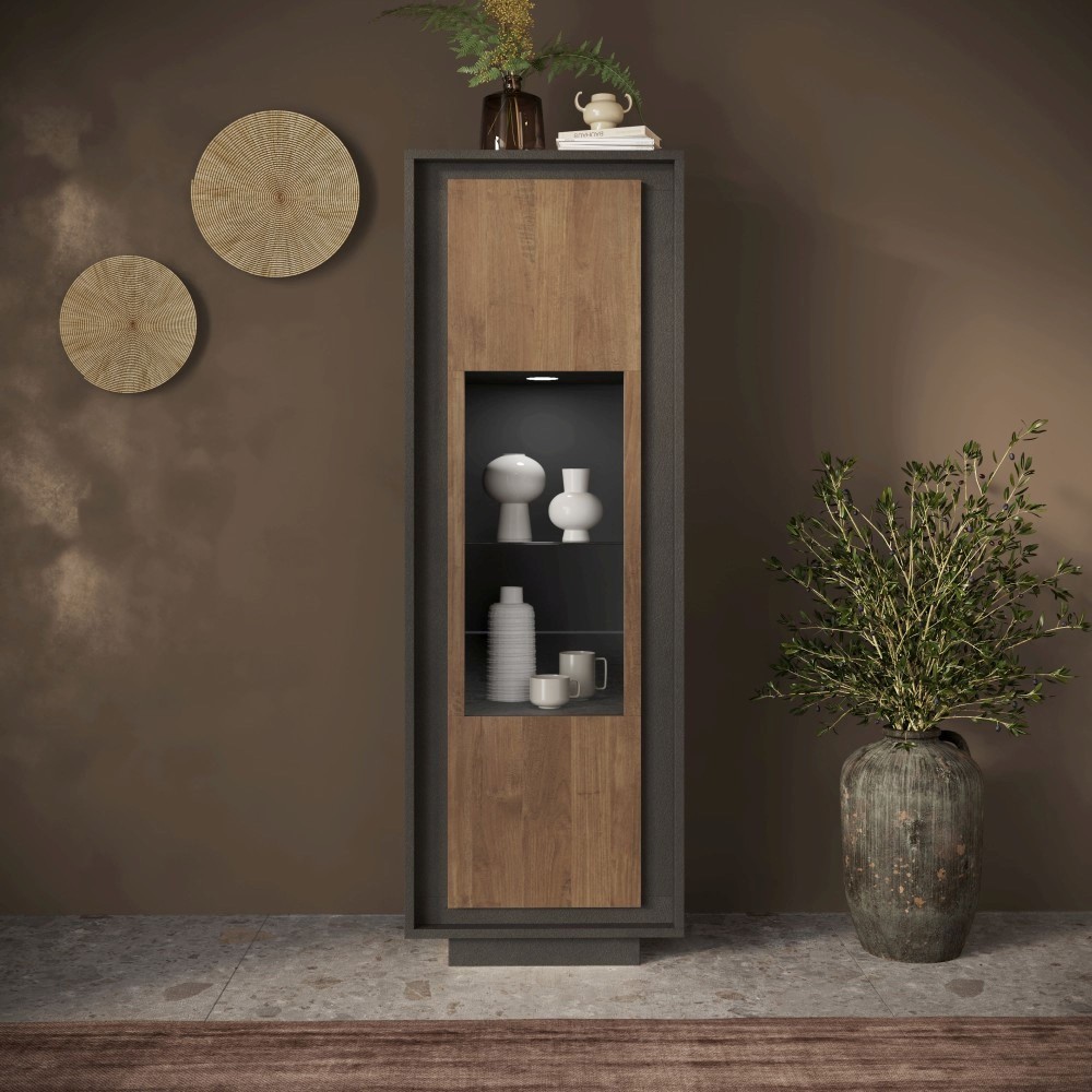 Dotata di un’anta in vetro con ripiani interni, consente di esporre piatti, bicchieri e decorazioni valorizzandoli e proteggendoli dalla polvere. La struttura lava abbinata al fondo Mercure Oak crea un contrasto elegante e caldo, perfetto per soggiorni contemporanei e moderni.