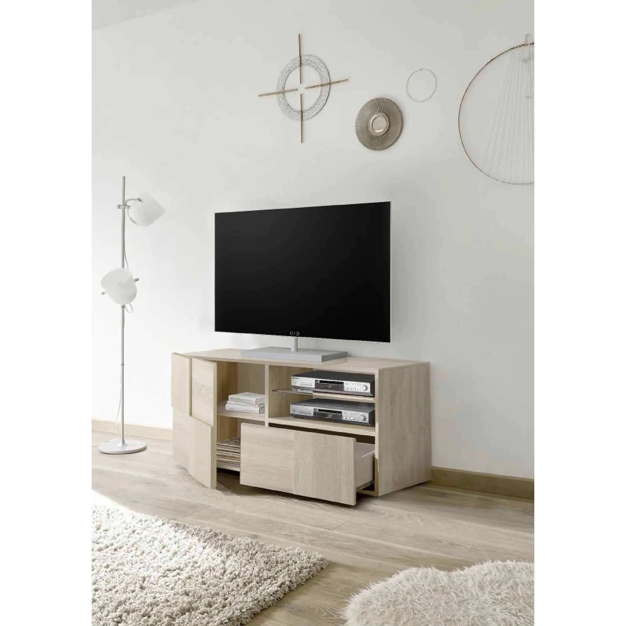 Scopri il porta TV DAMA, un elegante complemento d'arredo per il tuo soggiorno moderno. Questo mobile compatto è progettato per offrire funzionalità e stile, con una struttura che include 1 anta, 1 cassetto e un pratico vano a giorno con mensola, ideale per riporre lettore DVD, decoder, console e altri oggetti personali, mantenendoli sempre a portata di mano.