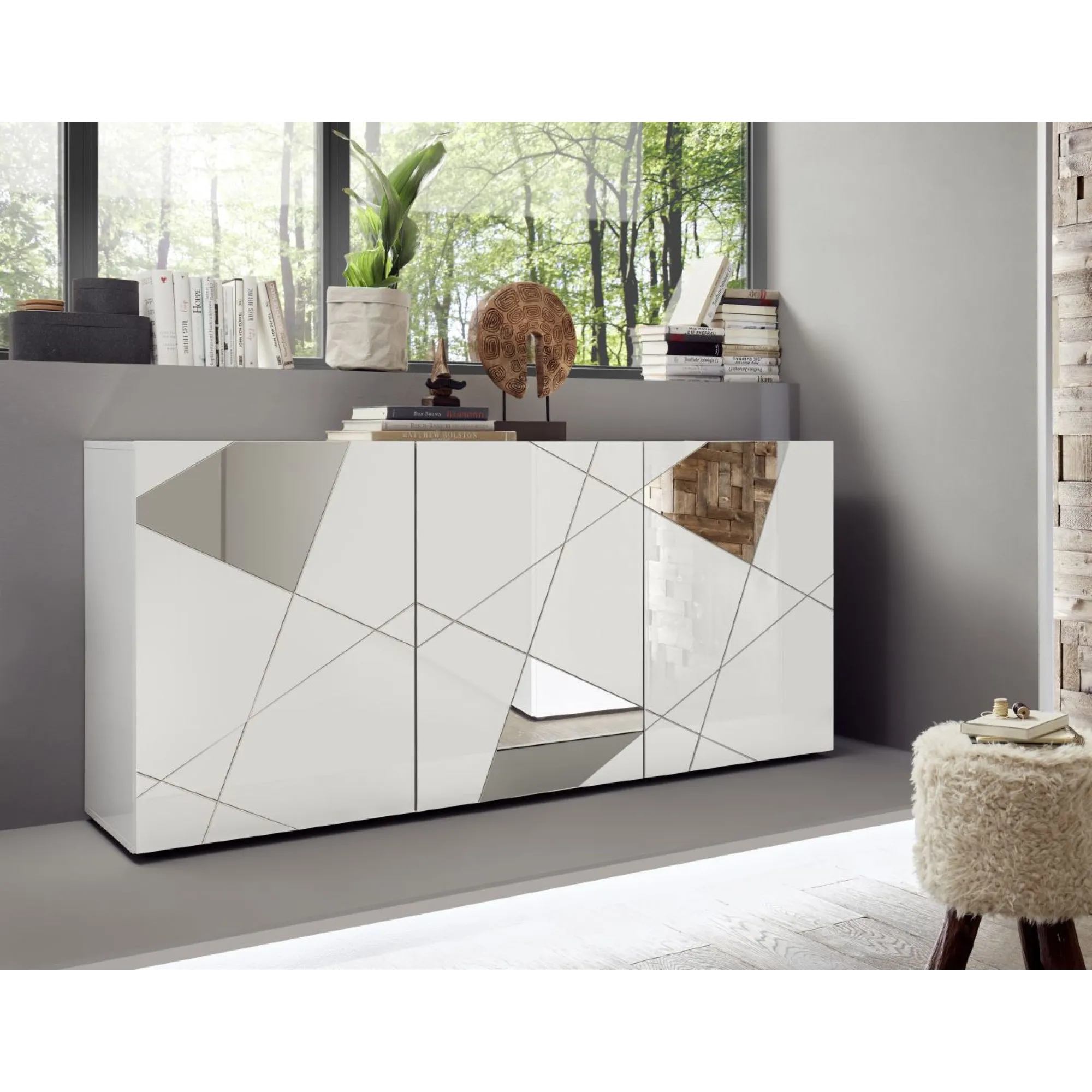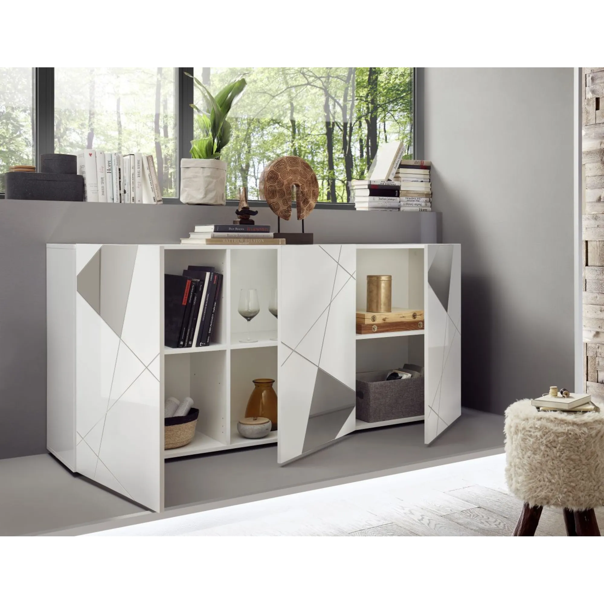 Scopri la Madia VITTORIA 3 Ante Bianco Lucido Serigrafato, un complemento d'arredo pensato per trasformare il tuo soggiorno in uno spazio moderno ed elegante, arricchito da un tocco di estrosità. Perfetta per chi desidera unire funzionalità e design, questa madia offre ampio spazio per organizzare utensili e oggetti di casa.