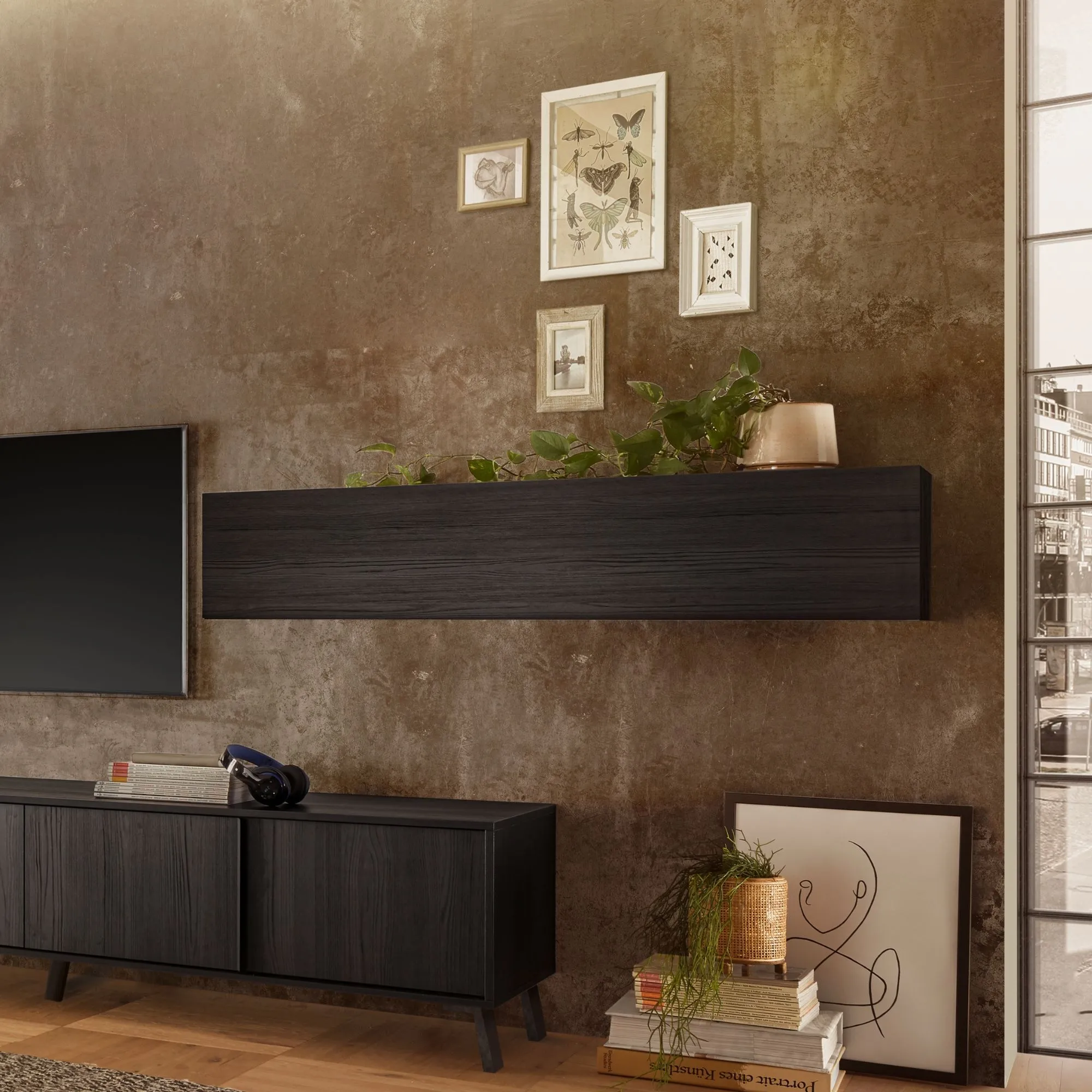 La finitura in nero frassinato con texture effetto legno dona eleganza e profondità agli spazi, integrandosi facilmente in ambienti moderni e minimalisti. Il sistema di apertura orizzontale a vasistas garantisce un accesso comodo agli oggetti interni, rendendo il pensile adatto anche alle composizioni modulari sospese in soggiorni e camere.