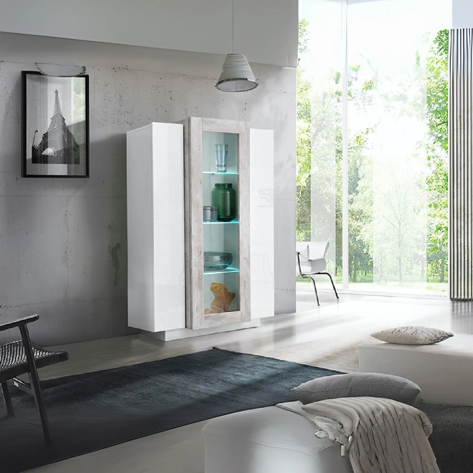 Scopri la Vetrina Band 1 Anta Bianco Lucido - Cemento, un complemento d'arredo moderno e sofisticato, perfetto per valorizzare il tuo soggiorno. Con il suo design elegante e funzionale, questa vetrina è ideale per esporre con stile cristalli, argenteria e oggetti preziosi.
