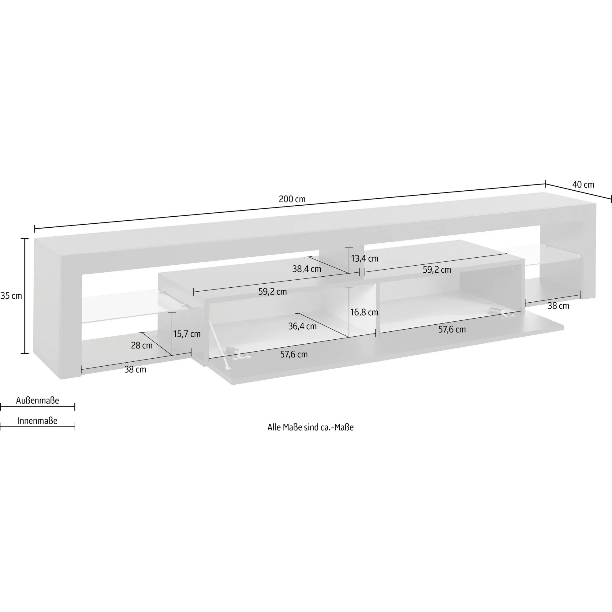 Facile da montare, il porta TV DIMORA pesa 34 kg e viene fornito con istruzioni chiare. Include 1 anta a ribalta e una struttura robusta con frontali spessi 16 mm. Le dimensioni sono 200 x 40 x 35 cm (LxPxA), rendendolo spazioso e capiente.