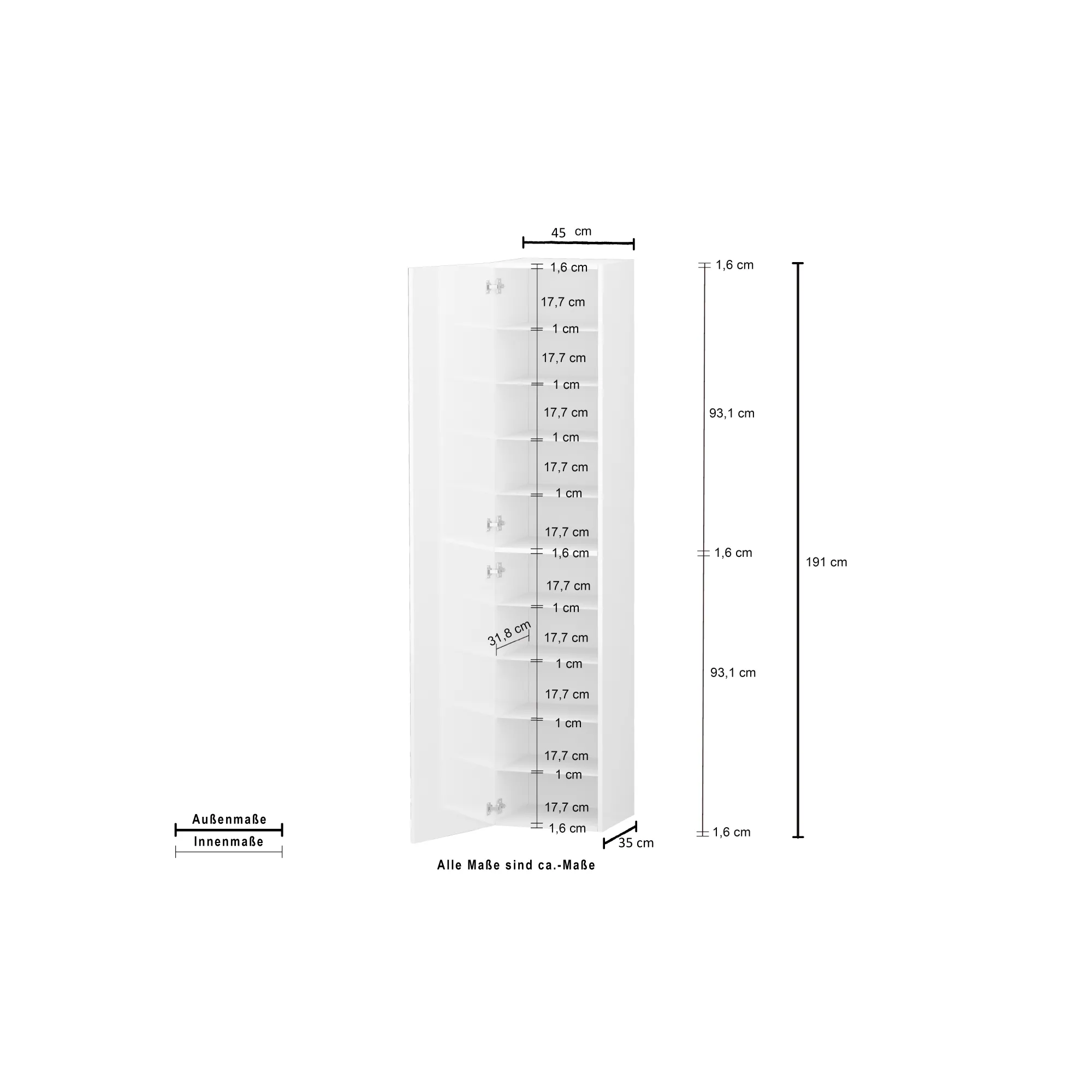 Le dimensioni compatte di 45 x 35 x 191 cm rendono la scarpiera HARMONY perfetta per ambienti di varie dimensioni, mentre i suoi 9 ripiani interni offrono ampio spazio per riporre fino a 20 paia di scarpe. Realizzata con materiali di alta qualità, la struttura e i frontali spessi 16 mm garantiscono una durata eccezionale nel tempo.