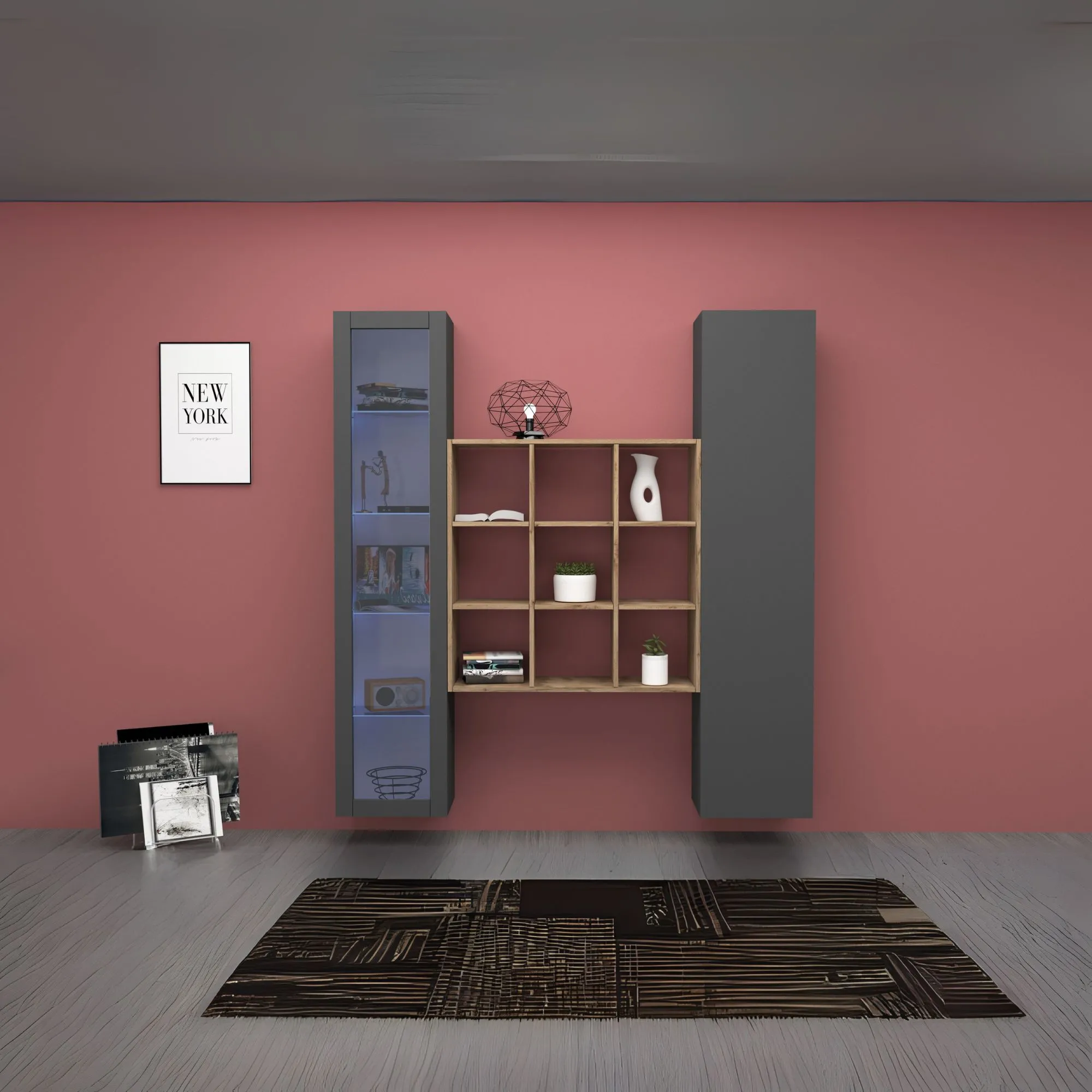 Parete Attrezzata Zona Giorno L.170xP.30xH.180 cm Antracite Opaco con Libreria Rovere Wotan Design Moderno - York