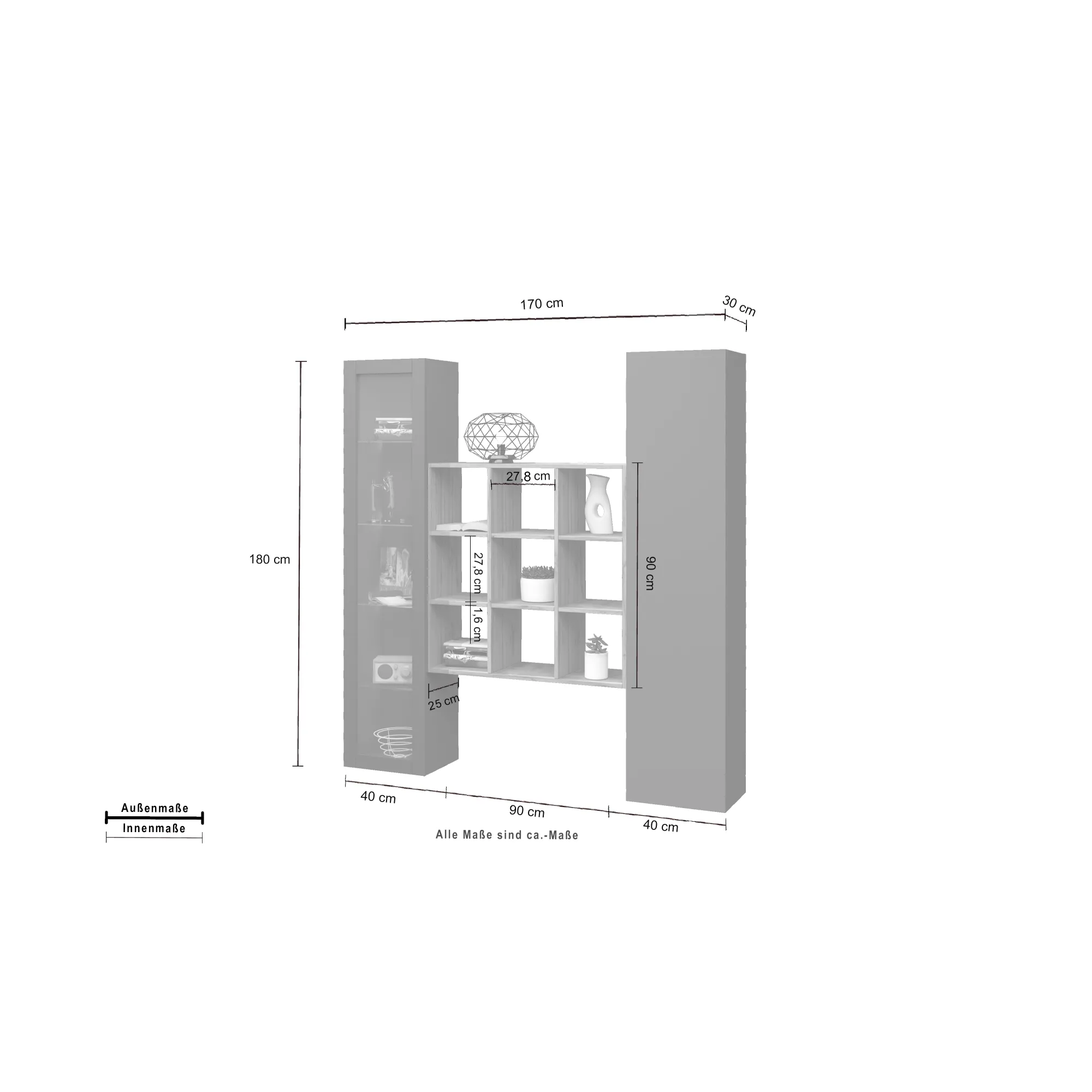 - Composizione: colonna armadio, vetrina, libreria con 9 vani.