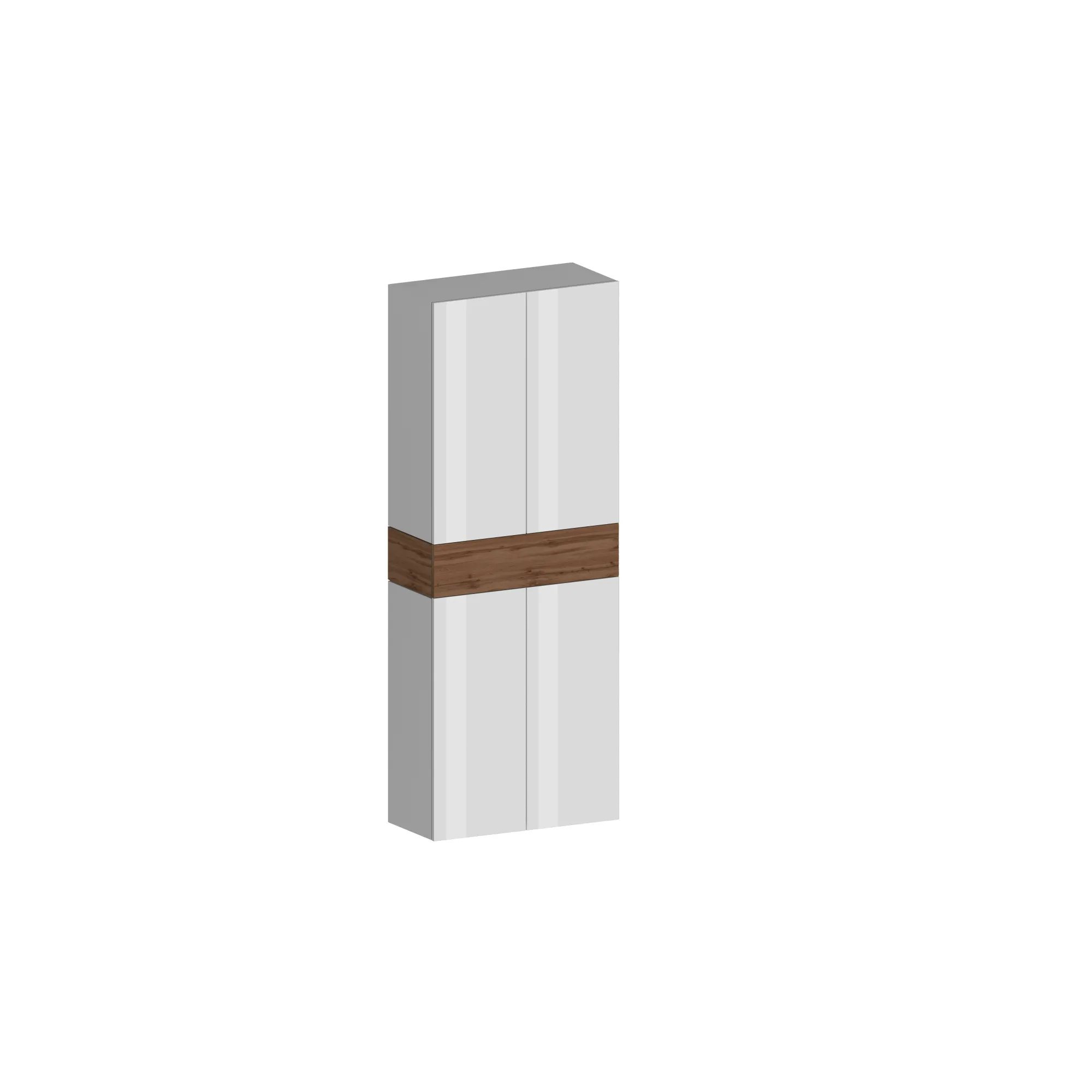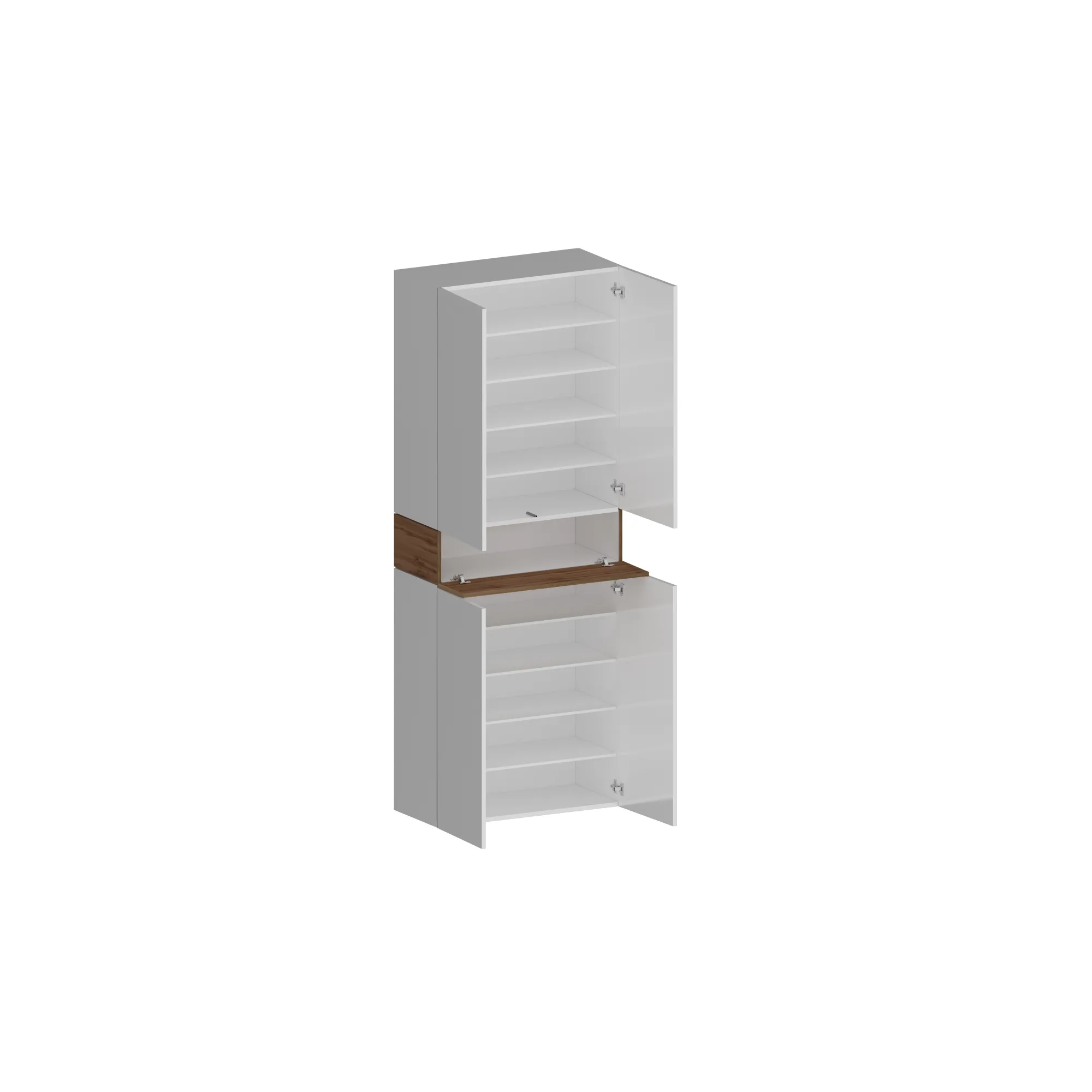 Armadio scarpiera VELVET 76×35×200 cm con 4 ante battenti e 1 anta a ribalta, ideale per ospitare fino a 40 paia di scarpe. Dotato di 8 ripiani interni, è realizzato in legno nobilitato riciclato con struttura e frontali da 16 mm. Finitura bicolore bianco lucido e rovere wotan. Made in Italy. Eleganza e capienza per ogni ambiente.