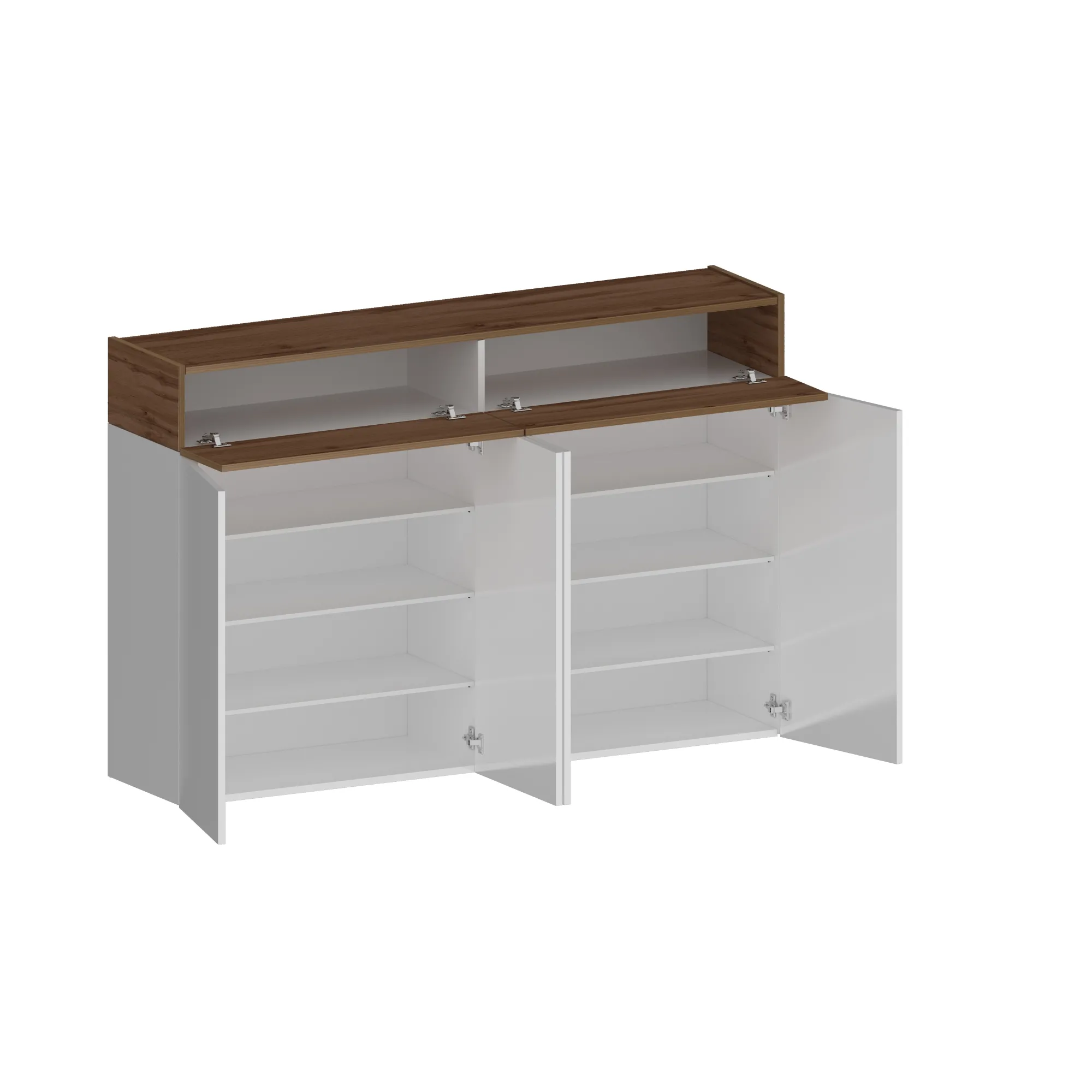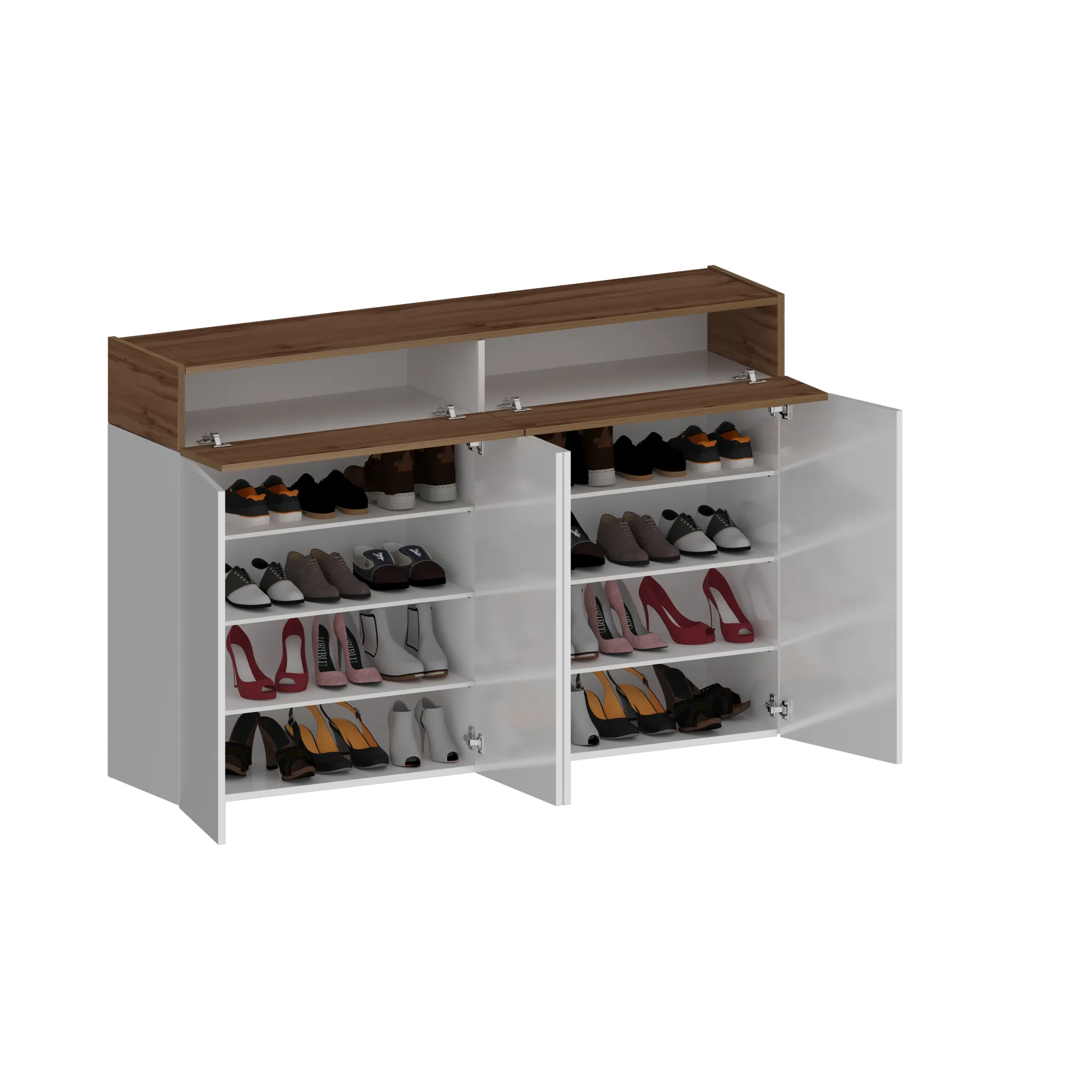 La struttura bicolore in bianco laccato lucido e rovere wotan non solo aggiunge un tocco di classe, ma anche funzionalità grazie ai comparti superiori con ante a ribalta, perfetti come portaoggetti. Con un interno spazioso dotato di 6 ripiani, questa scarpiera può ospitare fino a 24 paia di scarpe, garantendo un'organizzazione ottimale delle calzature.