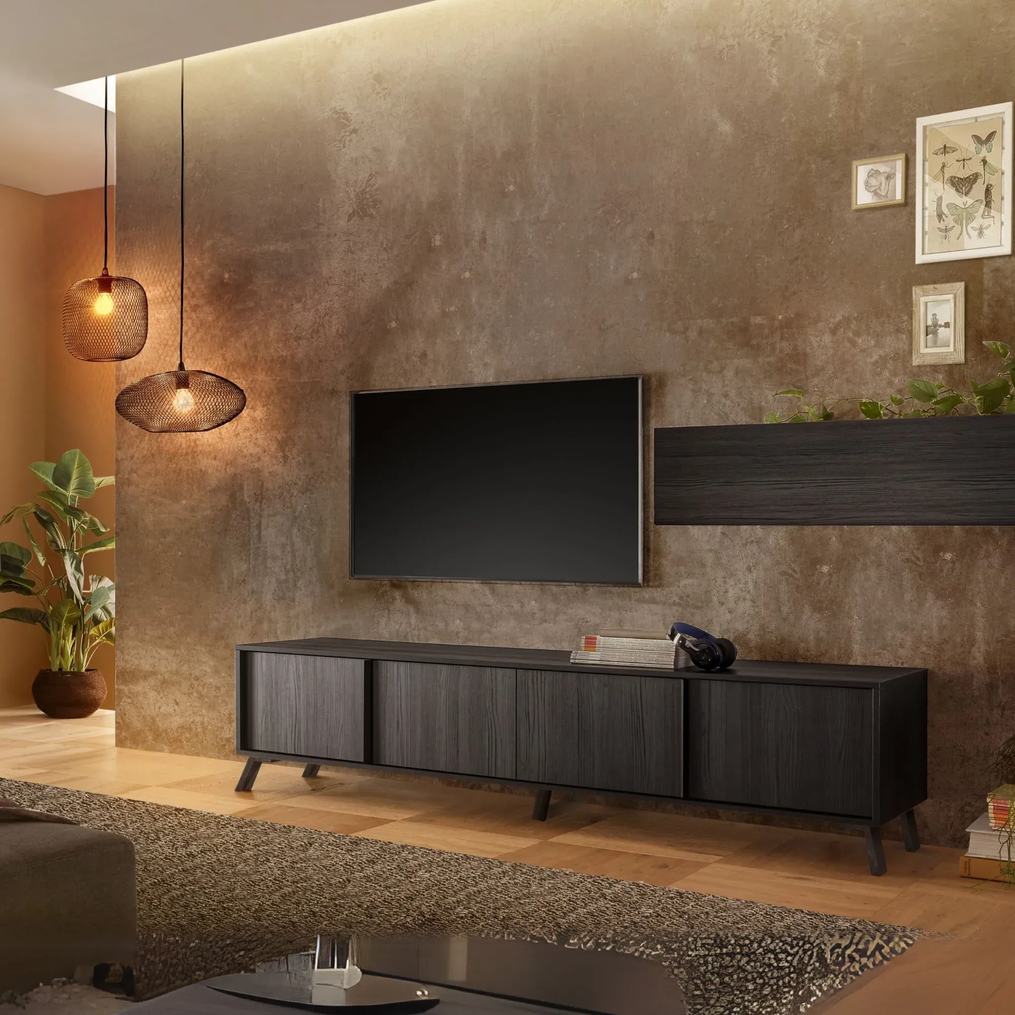 La finitura Nero Frassinato effetto legno materico valorizza l’ambiente con eleganza sobria, mentre le linee pulite e i piedini metallici alleggeriscono l’insieme. Le quattro ante offrono un ampio vano contenitore facilmente accessibile.