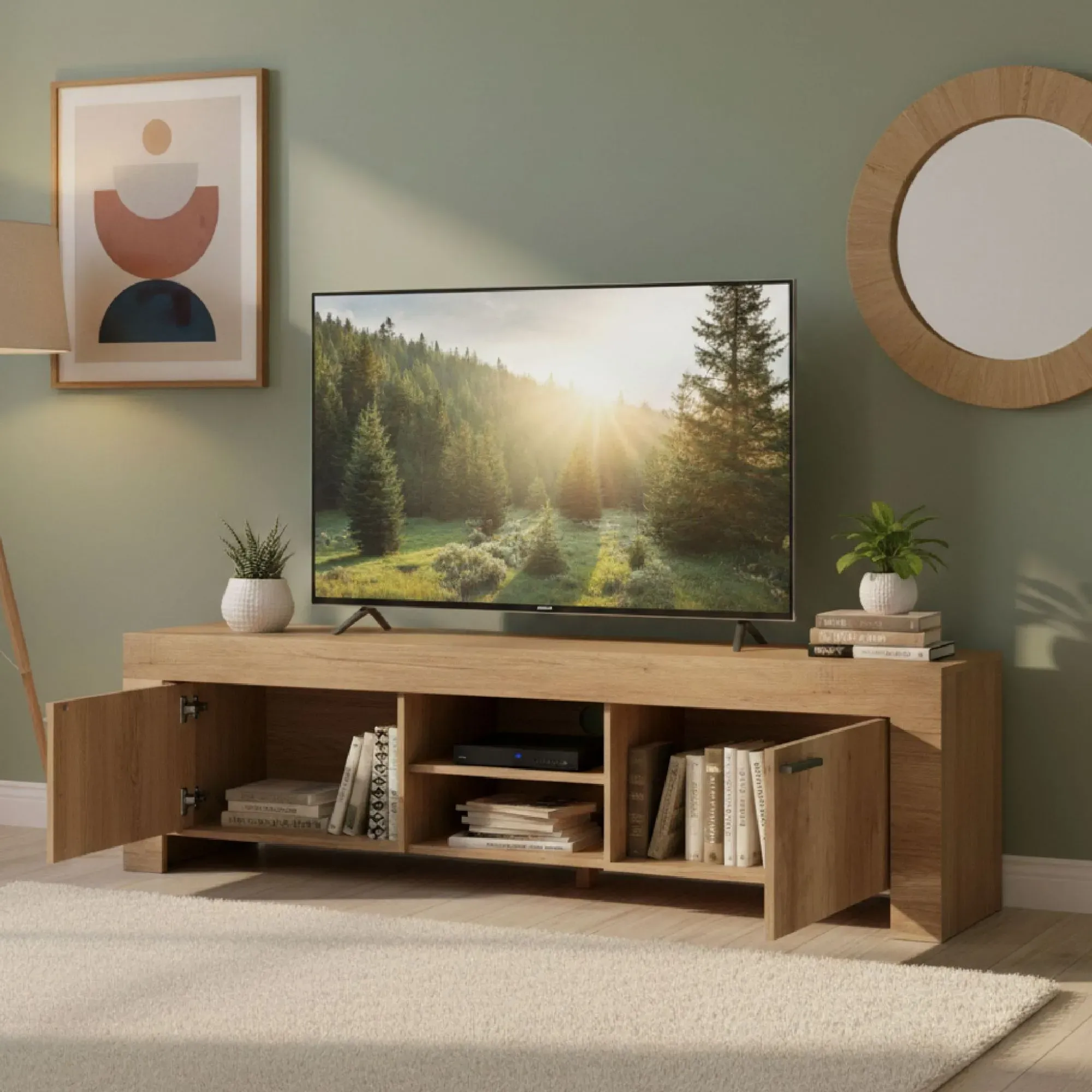Porta TV 180x53x43 cm in finitura Rovere Canyon con vano a giorno centrale e due ante laterali: mantiene decoder e console in ordine, dona calore al living e ottimizza lo spazio. Struttura robusta, schienale in MDF, maniglie in ABS, montaggio semplice e stile moderno.